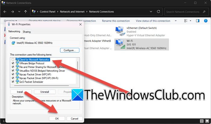 此方法暂时禁用特定网络适配器的功能,而不删除系统文件。它安全、可逆,非常适合不喜欢命令行工具的用户。它阻止适配器使用 SMB 文件/打印机共享、网络登录或域身份验证功能。您可以按照下面提到的步骤通过网络适配器 GUI 禁用客户端。为此,请按照您尝试卸载它时(遇到此错误时)所采取的步骤进行操作。不要卸载它,而是取消选中该选项并单击“确定”。