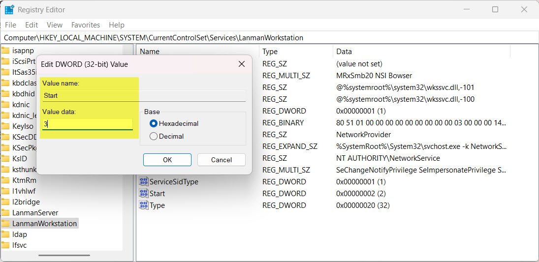 对于微软网络客户端,我们需要寻找兰曼工作站。单击它,然后双击开始并设置其值数据从 2(自动)或 3(手动)到 4(禁用)。