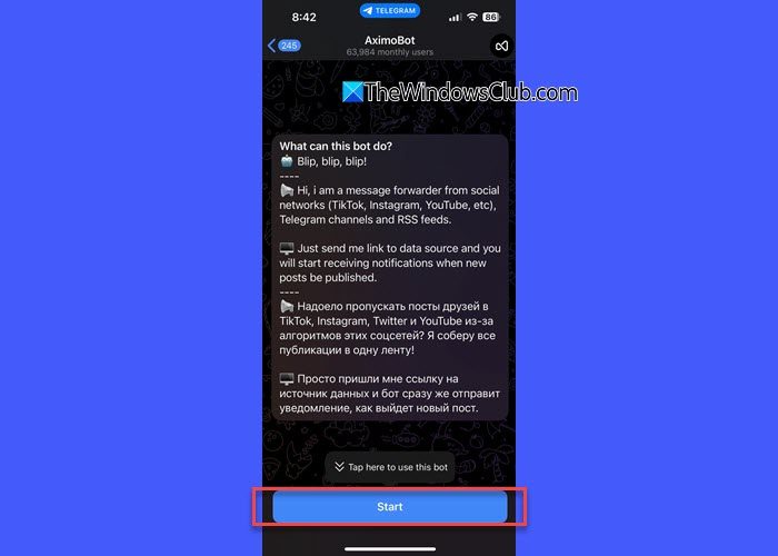 首先在您的设备上启动 Telegram。在搜索栏中,输入“AximoBot”并从结果中选择机器人。轻敲开始来激活它。