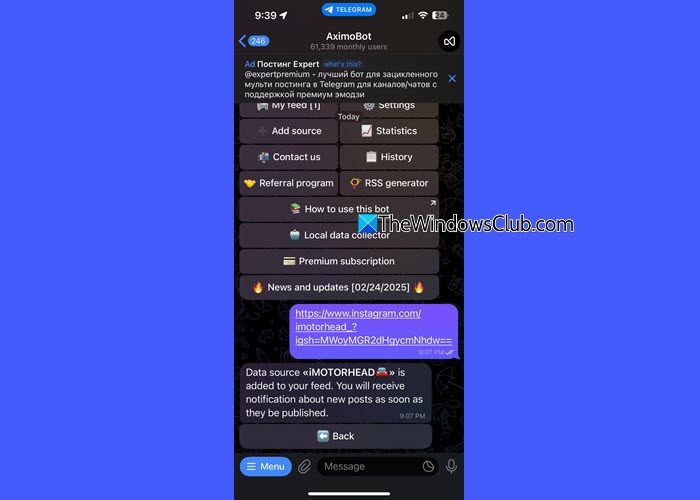 在这篇文章中,我们将看到如何使用 AximoBot 跟踪被阻止的 Instagram 帐户。 AximoBot 是一个聚合机器人,它从不同的资源收集更新并将其直接显示到您的 Telegram 聊天、群组或频道中。它支持各种社交媒体平台,包括 TikTok、Instagram、YouTube、Twitter、Facebook 和 Telegram 本身。
