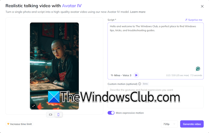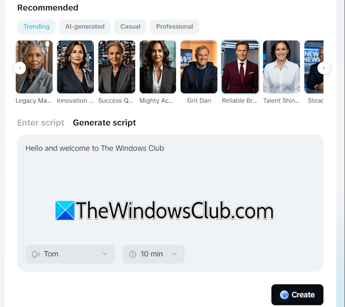 选择任一可用的 AI 头像并输入脚本。如果您没有脚本,可以使用“生成脚本”选项。完成后,单击“创建”按钮。使用这款 AI 工具,您可以生成长达 10 分钟的 AI 头像视频。此外,它还具有自动口型同步功能,使您的 AI 头像看起来更加真实。