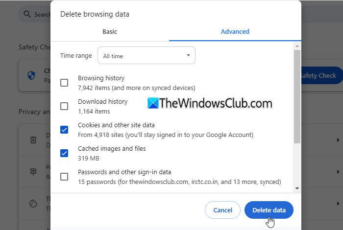 如果Chrome Remote桌面被卡在黑屏上,则缓存数据可能会干扰远程会话。清除缓存和cookie有助于解决与存储数据,过时的会话或损坏的浏览信息有关的问题。