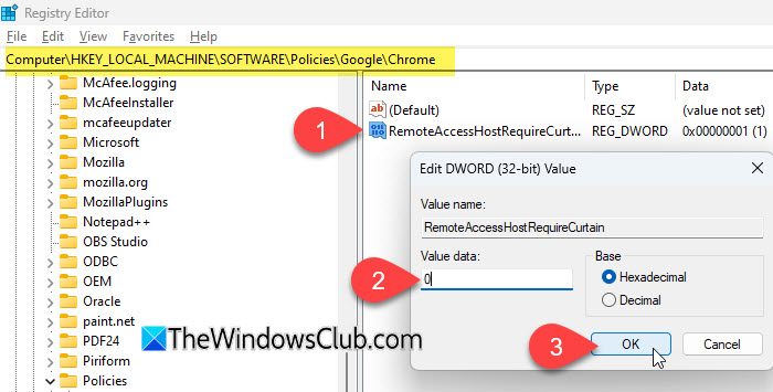定位RemoteAccessHostRequireCurtain在右窗格中。双击它并设置价值数据到0。如果键不存在,则在远程计算机上未启用窗帘模式。