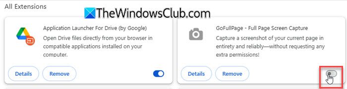 在远程计算机上打开Google Chrome。在地址栏中,输入chrome://extensions/然后按进入。查找控制屏幕共享或远程访问的扩展名(屏幕录制扩展程序,广告阻滞剂,VPN或代理扩展程序等)。通过切换将每个扩展程序一个一个接一个地禁用。