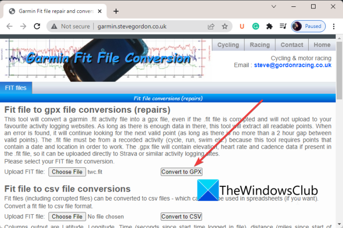 Garmin Fit File Conversion 是另一种可将 FIT 转换为 GPX 的在线工具。它是一个专用的简单工具。您只需在浏览器中打开此工具,然后选择一个输入文件即可。之后,单击转换为GPX按钮开始转换。转换完成后,您可以将生成的 GPX 文件下载到您的计算机。