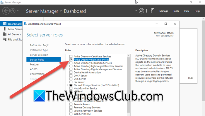 - 现在,勾选复选框活动目录域服务然后继续单击“下一步”按钮,直到到达确认页面。