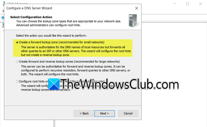 - 单击“下一步”,然后选择创建正向查找区域(建议用于小型网络)。单击“下一步”。