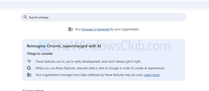 应用上述策略或注册表更改后,您可能会在 Chrome 设置页面或主三点菜单中看到消息“您的浏览器由您的组织管理”。这是正常现象,仅表明策略已应用于浏览器。无需担心 - 您可以安全地忽略此消息。