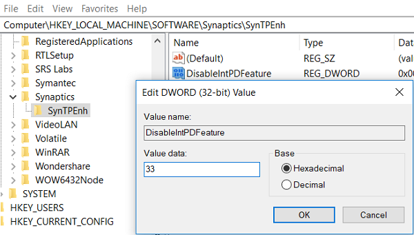 HKEY_LOCAL_MACHINE\SOFTWARE\Synaptics\SynTPEnh