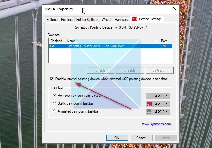 如果找不到此设置,则必须在笔记本电脑上安装通用 Synaptics 触摸板设备驱动程序。由于制造商根据自己的需要定制 Synaptics 触摸板驱动程序,因此他们可能无法在设置中选择禁用触摸板。
