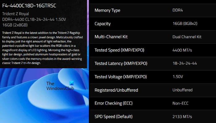 制造商的网站提到了 RAM 的默认 SPD 速度和 XMP 速度。您可以从那里阅读此信息。例如,上面的截图显示了型号为F4-4400C18D-16GTRSC的Trident Z Royal RAM的规格。如果你看一下它的规格,它的SPD速度是2133 MT/s,它的测试速度或XMP速度是4400 MT/s。制造商的网站上还提到 RAM 是否支持 XMP 配置文件。