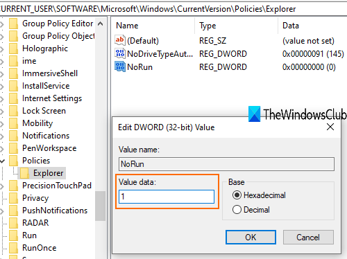 双击此 NoRun 值,将打开一个框。在那里,设置价值数据到1,然后按好的。