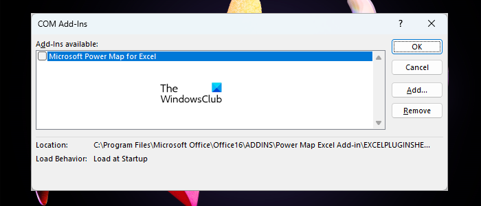 在某些情况下,Microsoft Office 应用程序中安装的加载项会导致问题。您可能就是这种情况。禁用 Excel 中的所有加载项并检查是否可以保存文件。如果 Excel 这次没有崩溃,则说明是某个加载项导致了此问题。要识别有问题的加载项,请开始逐一启用加载项,并在每次启用加载项时保存文件。当问题再次出现时,您刚刚启用的加载项就是罪魁祸首。