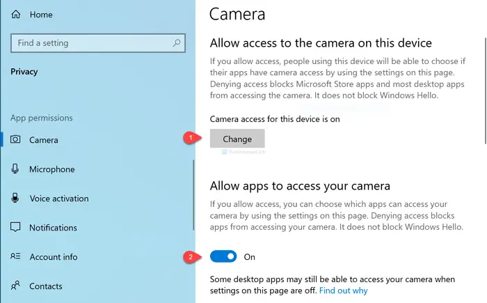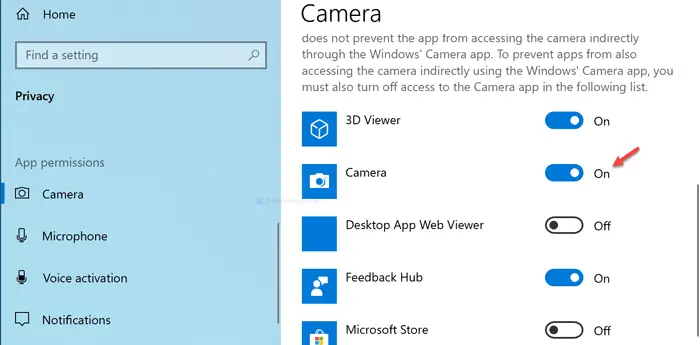 - 检查是否允许桌面应用程序访问您的相机设置已打开。 否则,切换相应的按钮。