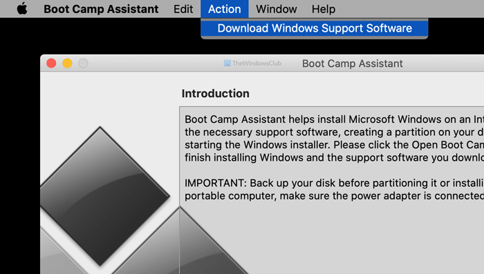 首先,请确保笔式驱动器已连接到您的计算机。 否则,您必须使用云存储或任何其他解决方案将 macOS 下载的工具移动到 Windows 安装。 接下来,在计算机上打开 Boot Camp 助手(按 Command+Space > 搜索 Boot Camp > 单击相应的结果)并选择操作 > 下载 Windows 支持软件选项。