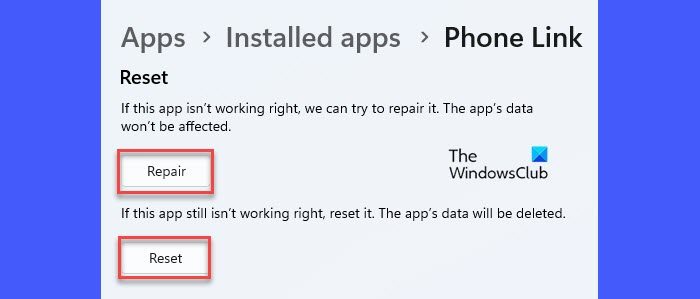 如果没有任何效果,则很可能您计算机上的 Phone Link 应用程序已损坏或配置错误。微软提供了修复和重置应用程序的选项。要执行相同的操作,请按照下面提到的步骤操作。