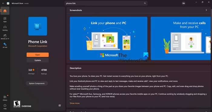 如果 Phone Link 和 Link to Windows 应用程序的版本存在差异,您将无法连接这两个设备。因此,我们需要确保这两个应用程序均已更新。要更新电话链接,请打开 Microsoft Store,搜索“电话链接”,然后单击“更新”。同样,更新到 Windows 的链接来自智能手机应用程序商店的应用程序。