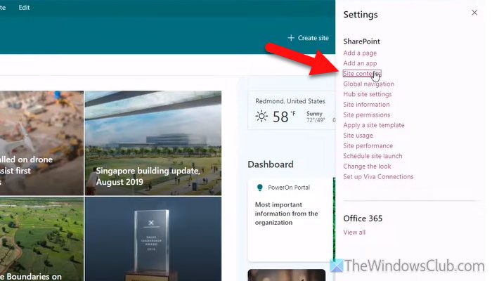 首先,登录您的 SharePoint 网站并单击设置齿轮图标。然后,选择网站内容选项并打开您之前创建的快捷方式的文件夹。
