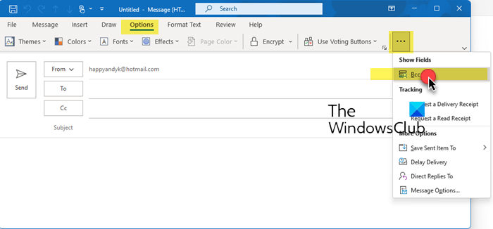 如果您要回复电子邮件,您会在“密件抄送”下方找到“密件抄送”选项信息选项卡。您可以在回复特定电子邮件时通过单击该选项来启用和禁用密件抄送字段。