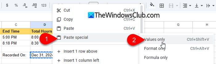 就像在 Excel 中一样,要将动态时间戳转换为 Google 表格中的静态时间戳,您可以复制包含动态公式的单元格,然后将其粘贴为值(右键单击该单元格,选择复制,然后再次右键单击并选择选择性粘贴 > 仅值)。