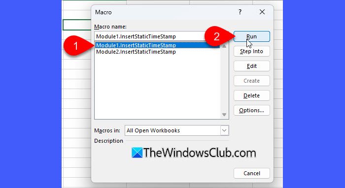 接下来,按Alt+F8打开宏对话框。选择要运行的宏(InsertDynamicTimeStamp 或 InsertStaticTimeStamp),然后单击跑步。