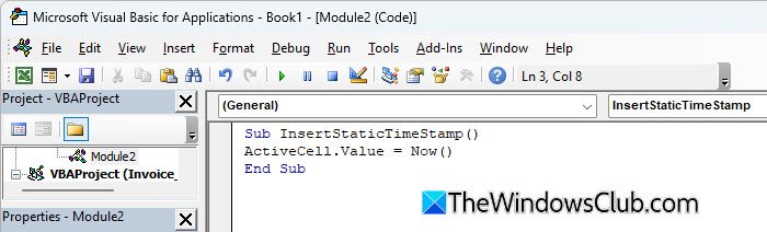Sub InsertStaticTimeStamp() ActiveCell.Value = Now() End Sub