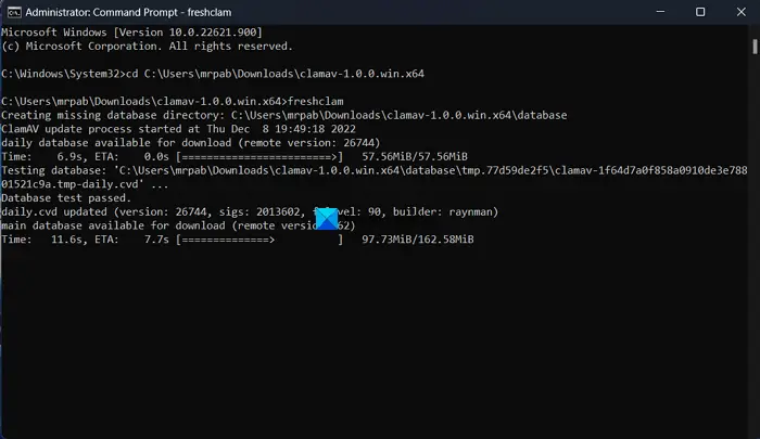 它将为 Windows 配置 ClamAV,并使其准备好使用和保护您的 Windows PC。 您可以使用以下命令扫描文件目录,将文件目录替换为要扫描的文件的路径,