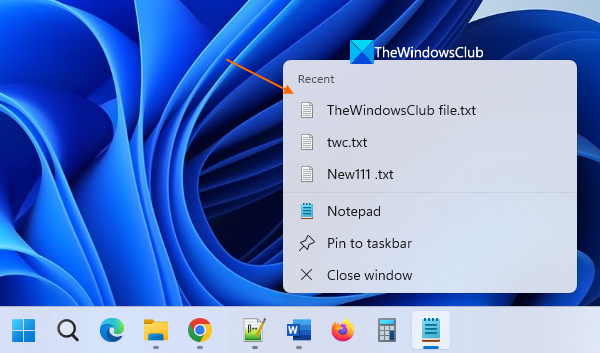 此选项有助于单独查看特定应用程序最近打开的文件列表。您需要做的是右键单击打开的应用程序(例如记事本或 MS Word)的任务栏图标,然后单击最近的部分将在该应用程序的右键单击菜单中可见。对于该部分中的每个最近项目,固定到此列表鼠标悬停时也可以看到该选项,这有助于将该项目保留在该列表中,这样,如果您打开越来越多的项目,它就不会被其他项目替换。