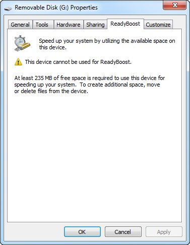 为了使 ReadyBoost 能够有效地加速您的计算机,闪存驱动器或存储卡应至少有 1GB 的可用空间。如果您的设备没有足够的可用空间用于 ReadyBoost,您会看到一条消息,告诉您在设备上释放一些空间(如果您想使用它来加速系统)。