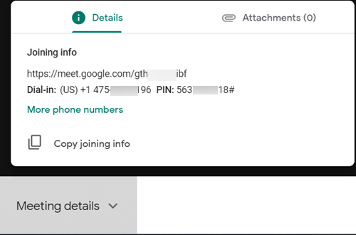 点击 '复制加入信息'并将会议详细信息粘贴到电子邮件或其他应用程序中。该选项已隐藏。要访问它,您需要单击“细节'然后选择'复制加入信息' 选项。