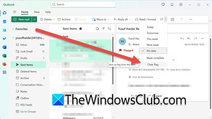 - 打开已发送的项目文件夹,通过标志列(单击列标题)进行排序,然后清除标志。发送项目,Outlook New:去
