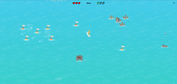 尽可能长时间地在海上冲浪,同时避开障碍物。通过收集爱心来增加你的生命,通过收集提升来增加你的速度。