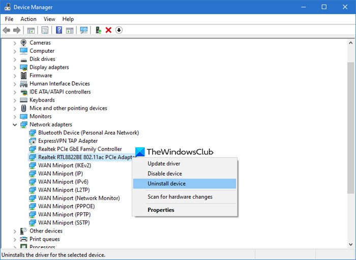 - 右键单击您的网络适配器并选择卸载设备。