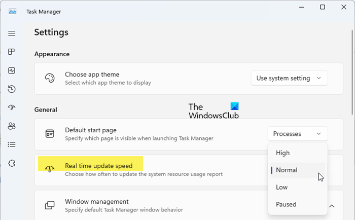 如果出现以下情况,任务管理器可能不会显示网络使用情况实时更新速度是已暂停在任务管理器设置中。 “实时更新速度”选项允许您选择在任务管理器中更新系统资源使用情况报告的频率。这也包括网络使用。