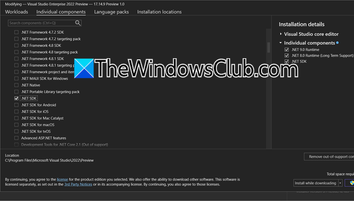 - 重新启动 Visual Studio 安装程序,再次打开它,但检查 .NET SDK。