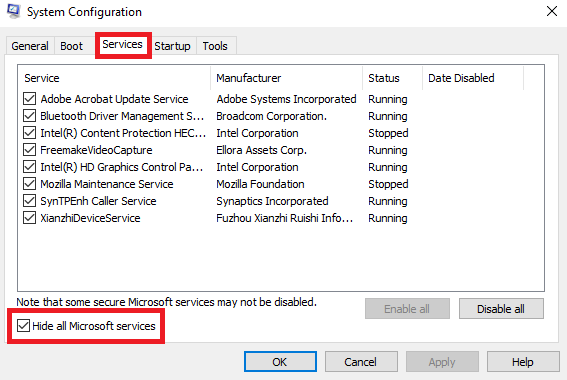 现在在“服务”选项卡下,选择“隐藏所有 Microsoft 服务',然后单击全部禁用。
