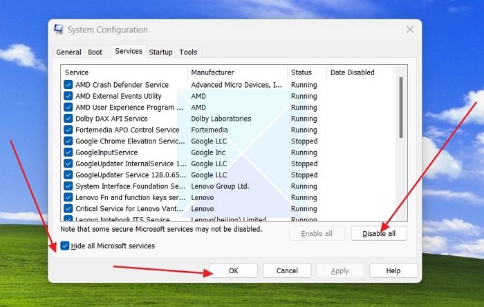 - 这将打开系统配置窗户。在系统配置中,转到服务选项卡并检查隐藏所有 Microsoft 服务选项。