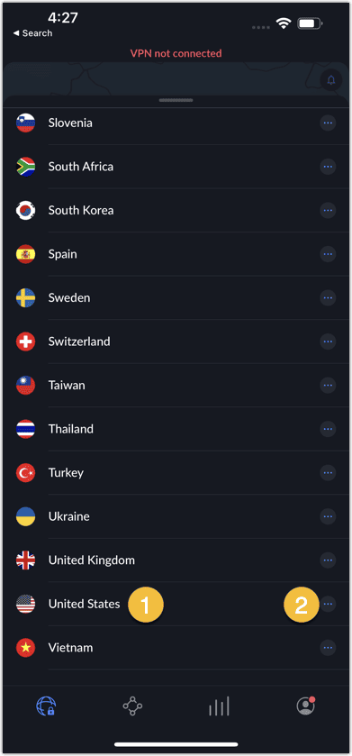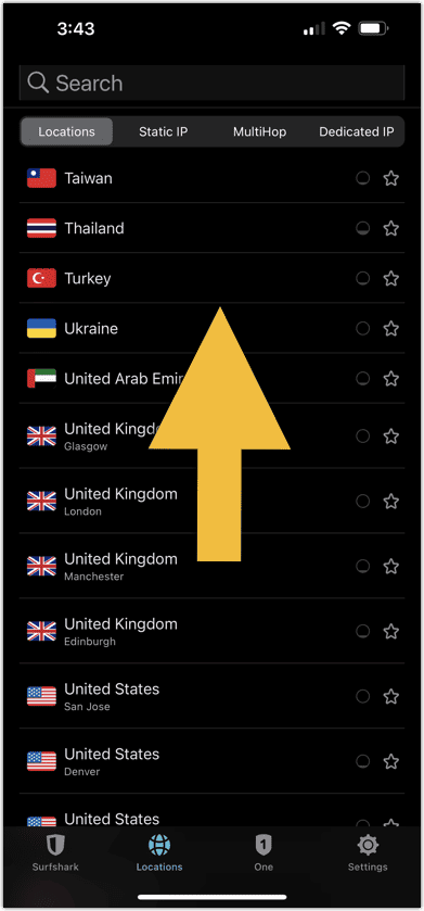 - 向下滚动位置列表,直到到达您想要更改位置的国家和城市。点击您想要的国家/地区-城市组合来更改位置。或者,您也可以使用搜索栏。