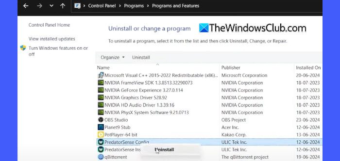 要修復捕食者,如果它在Windows 11/10 PC上不起作用,請嘗試卸載並重新安裝該應用程序。如果有任何矛盾的軟件,例如Acersense,請考慮將其刪除。如果捕食者正在打開但不顯示系統統計數據(CPU/GPU使用情況,溫度,風扇速度等),請重建櫃檯可能會有所幫助。