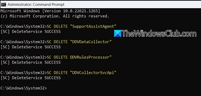SC DELETE "SupportAssistAgent" SC DELETE "DDVDataCollector" SC DELETE "DDVRulesProcessor" SC DELETE "DDVCollectorSvcApi"