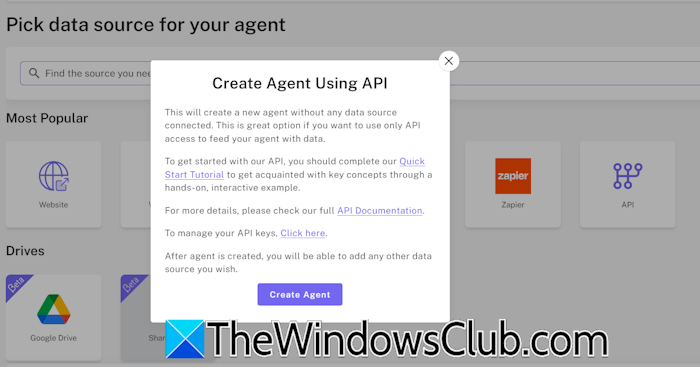 如果您不想添加數據源,則API是最佳選擇。您可以使用CustomGpt API密鑰來創建代理,而無需連接任何數據源。為此,登錄您的customgpt.ai儀表板,然後單擊新代理按鈕。現在,單擊API,然後單擊創建代理。要開始使用CustomGpt API密鑰,請參閱其API文檔。
