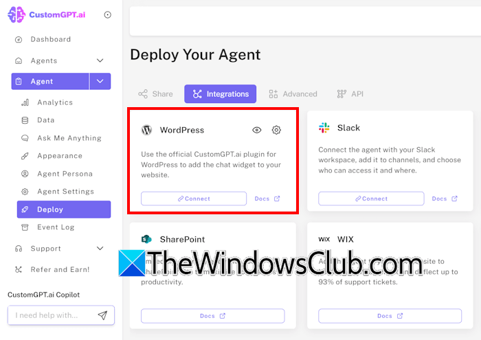 如果您有WordPress網站,則可以通過安裝CustomGpt.ai插件直接部署代理。安裝插件後,轉到代理部署類別中的“集成”選項卡,然後單擊連接在WordPress選項下。