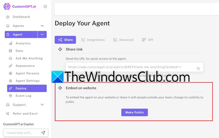 創建代理後,最後一步是將其集成到您的網站中。為此,複製嵌入代碼並將其粘貼到您的網站中。要獲取嵌入代碼,請打開您的代理設置,然後選擇部署左側類別。您將在分享右側的標籤。您只有在公開代理商的可見性之後才能獲得嵌入式代碼。