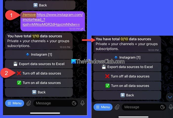 要從您的 Feed 中刪除特定 Instagram 帳戶(或任何其他來源),請使用/remove命令後跟帳戶鏈接。然後點擊適當的選項。