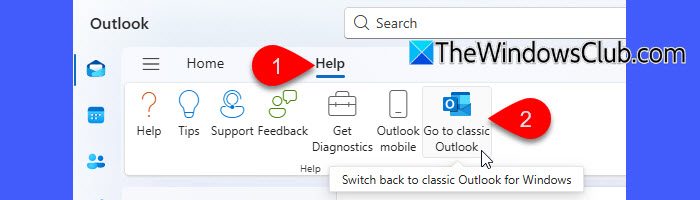 到,打開新 Outlook,轉到幫助功能區上的選項卡,然後單擊轉到經典 Outlook。出現提示時,確認切換。 Windows 版經典 Outlook 將自動啟動。