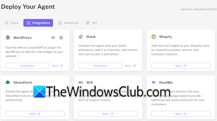 當您的代理準備就緒時,您可以將其部署到您的網站上,或將其與內容管理的工具(例如Progress Sitefinity)集成在一起。有關將Customgpt與內容管理工具集成的,請打開您的代理設置並轉到部署選項卡。現在,選擇一體化右側的標籤。您將看到可用於自定義AI集成的不同平台。在分享選項卡,您可以為代理生成嵌入式代碼。