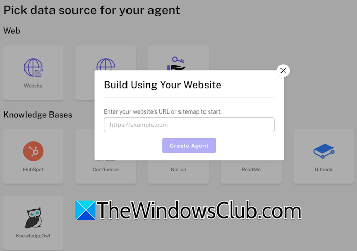需要知識庫來創建AI代理。您可以以不同的方式提供知識庫,例如添加您的網站站點或上傳文件。您還可以使用API創建代理。這將創建一個無需連接任何數據源的代理。
