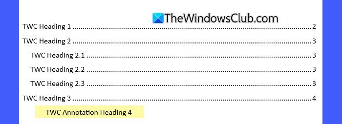 現在 TOC 將在第 4 級包含“TWC Annotation Heading 4”沒有頁碼,同時保留所有其他條目的頁碼。