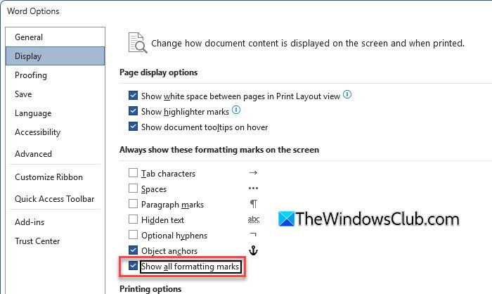 接下來,回到文件 > 選項 > 顯示和取消選中顯示所有格式標記。然後選擇您現有的目錄並將其刪除。