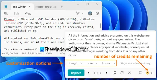 您也可以選擇所需的文字並將其複製到剪貼簿。那裡不存在編輯或更改特定版本的選項,但您可以長度,語氣, 和格式再次重寫文字的選項。您可以調整選項並使用再試一次圖標為此。但是,請注意,每次開始重寫過程時,都會花費您一個 AI 積分。